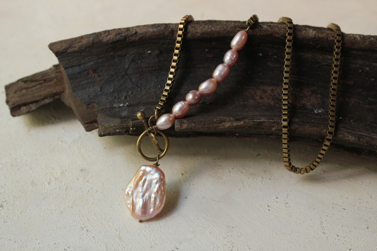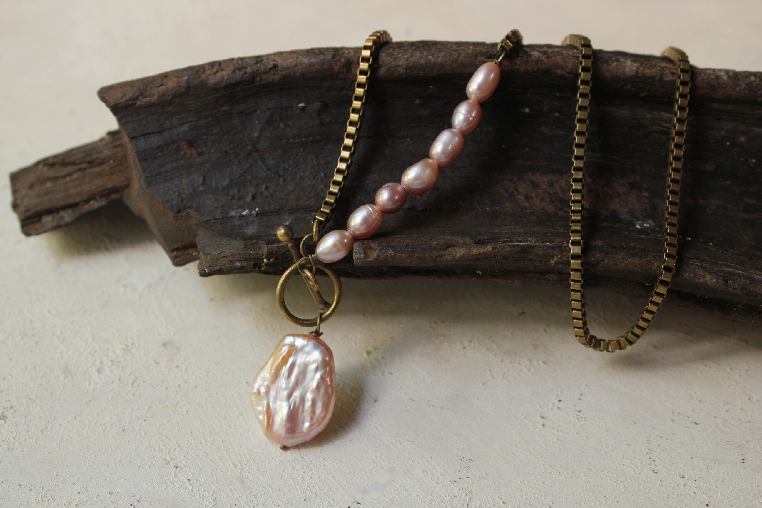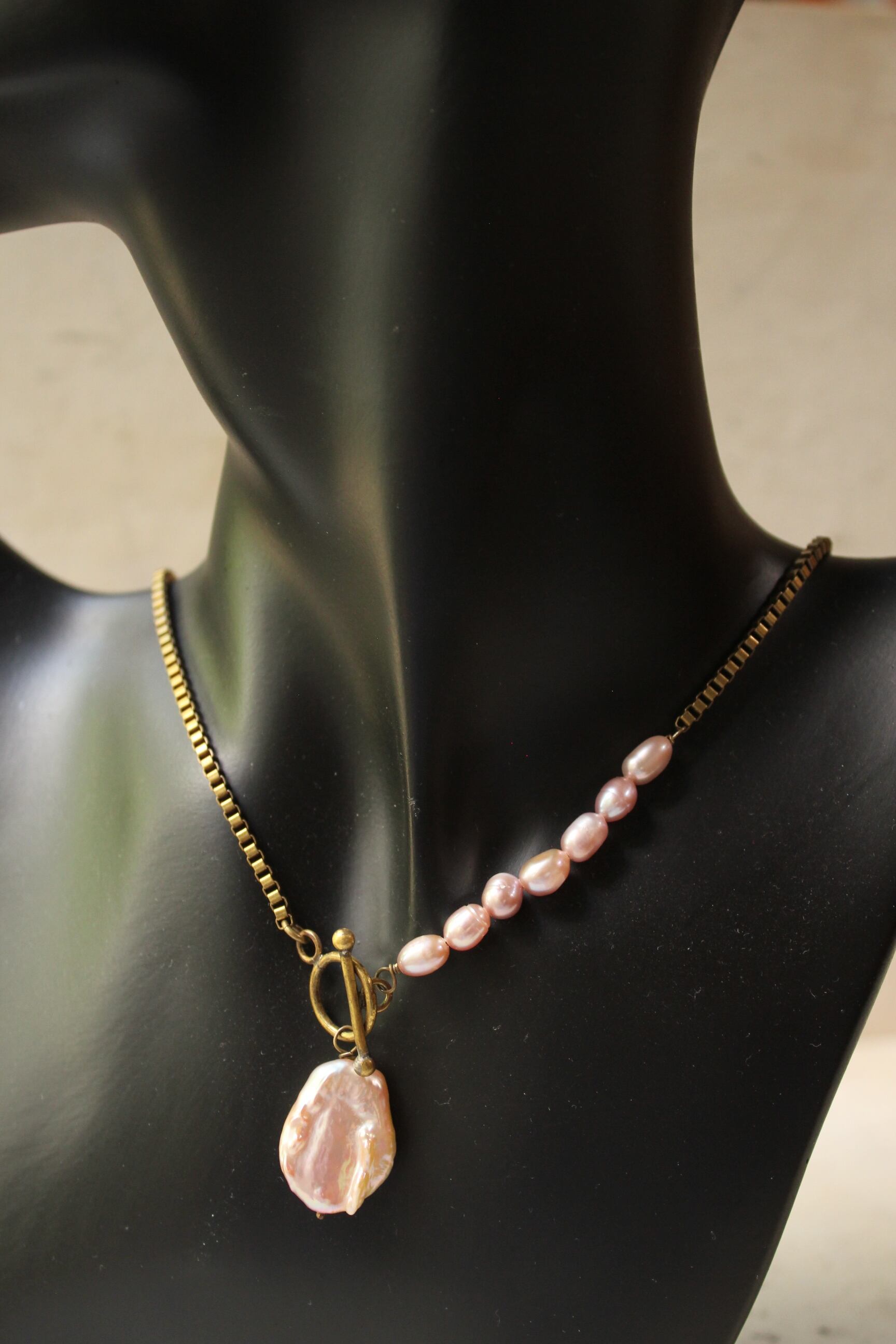 このネックレスは、ピンクの大ぶりケシパールとパープルピンクの淡水パールが見事に調和した、華やかでエレガントな一品です。