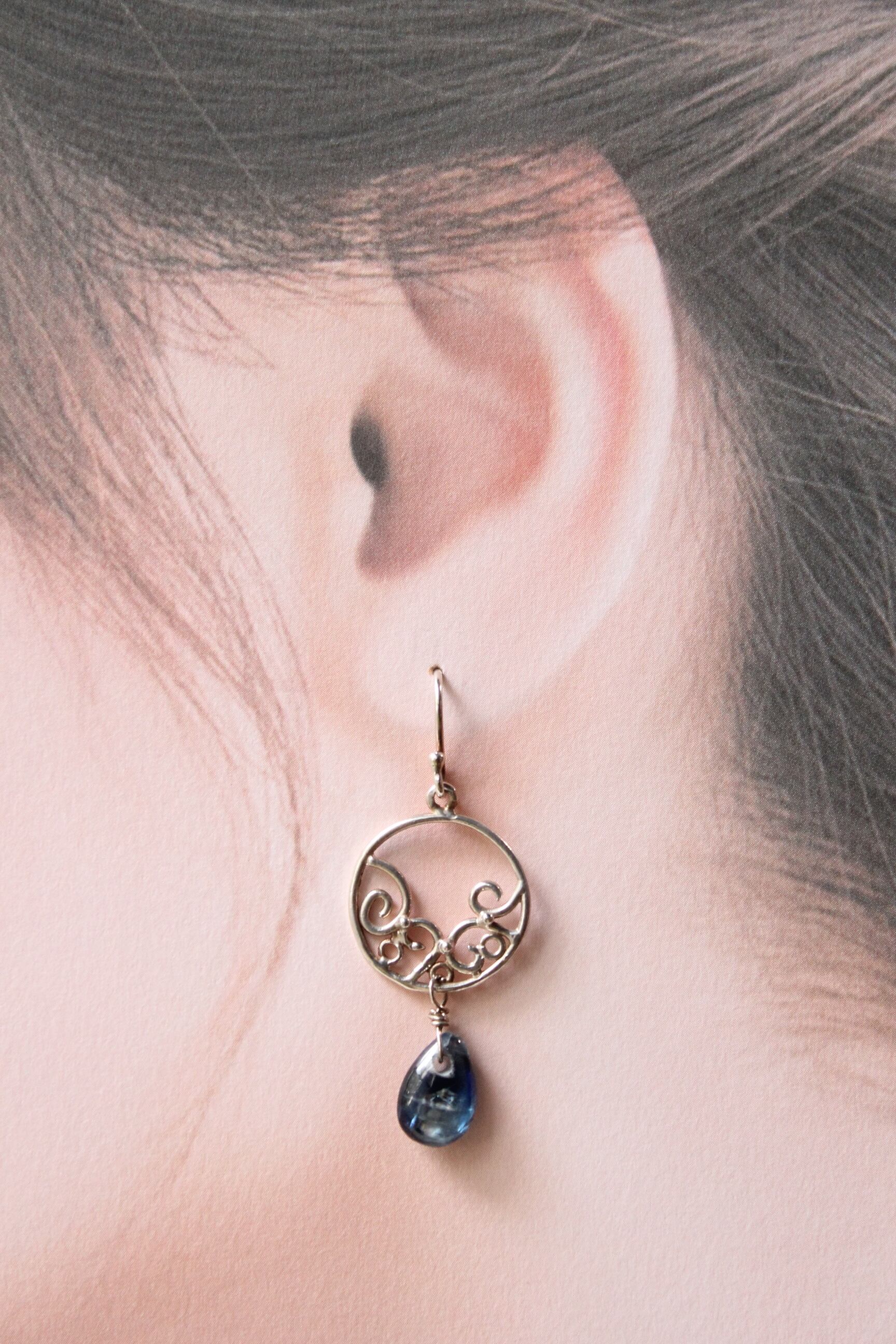 円の中に唐草模様を入れた透かしモチーフにカイヤナイトの石をつけています。