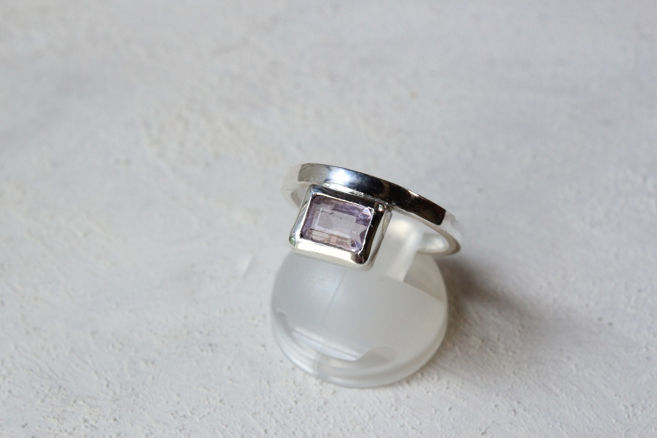 長方形のクンツァイトの石をを覆輪留したリングです。