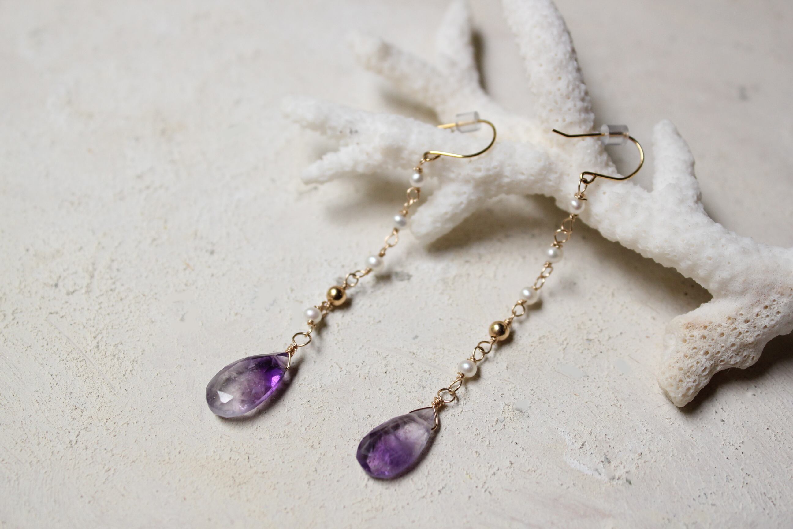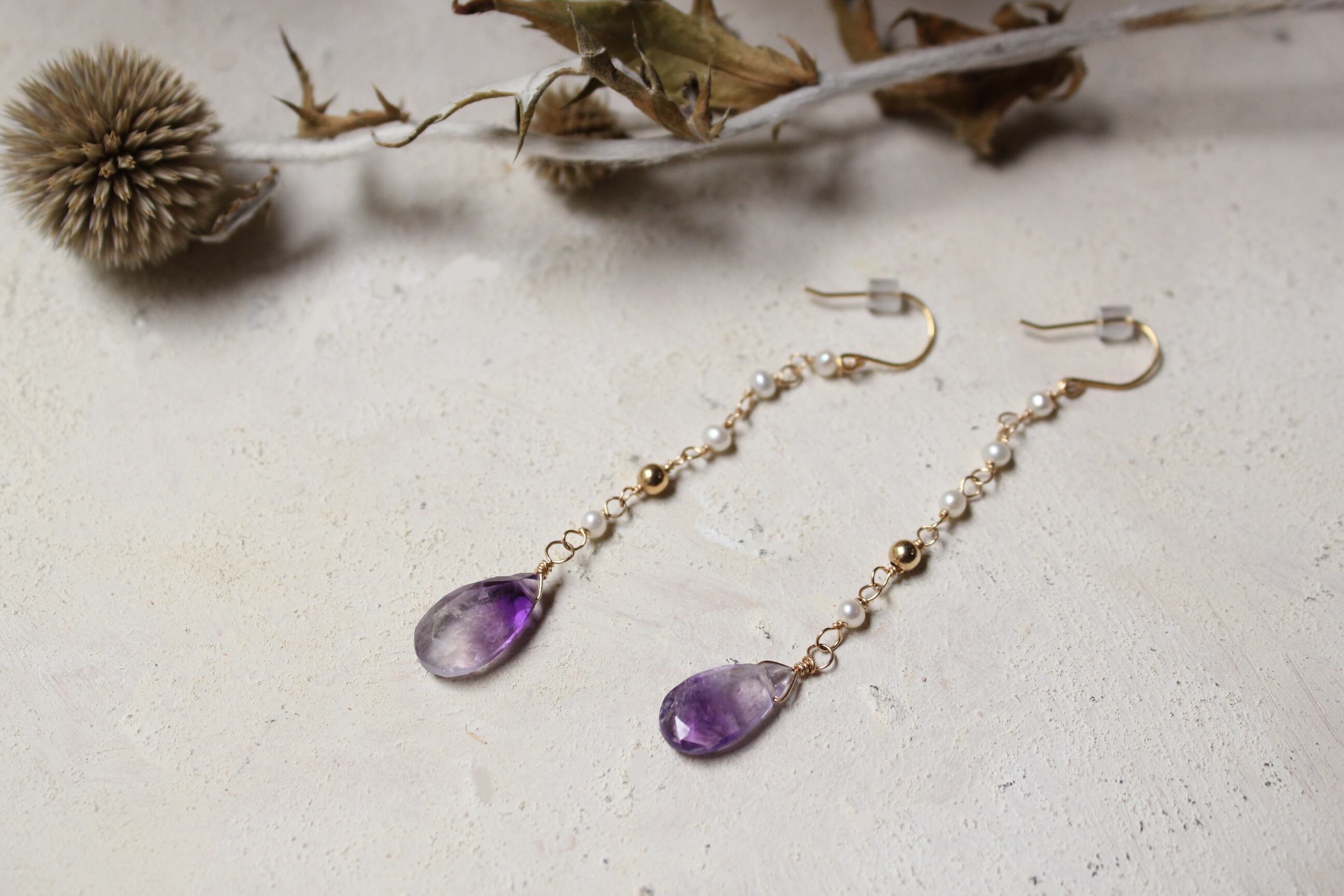 淡水パール、アメジストと14kgfのパーツを組み合わせた、ロングピアスです。