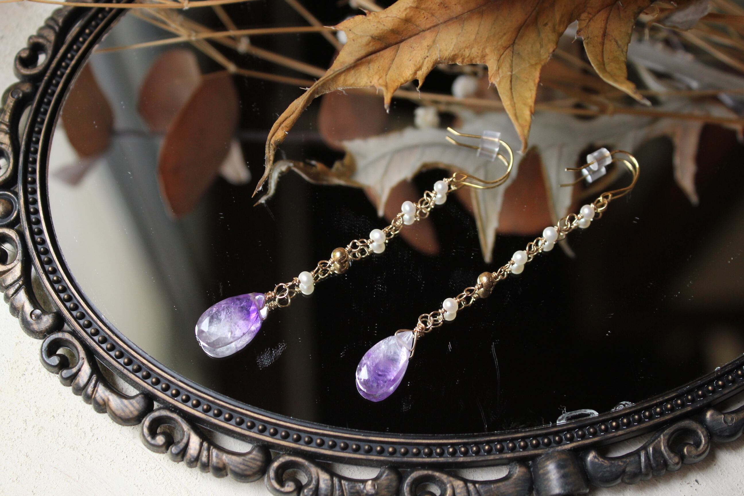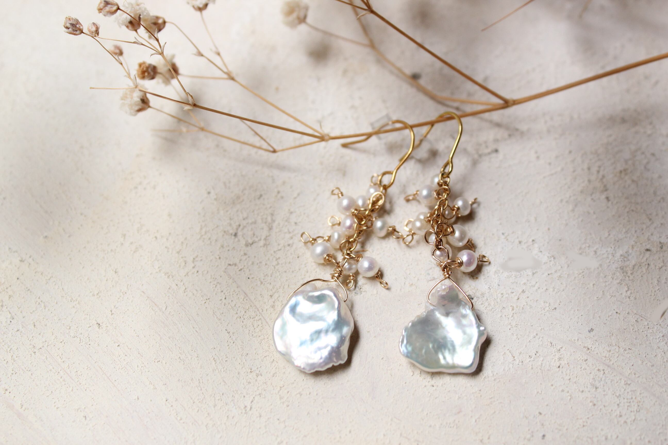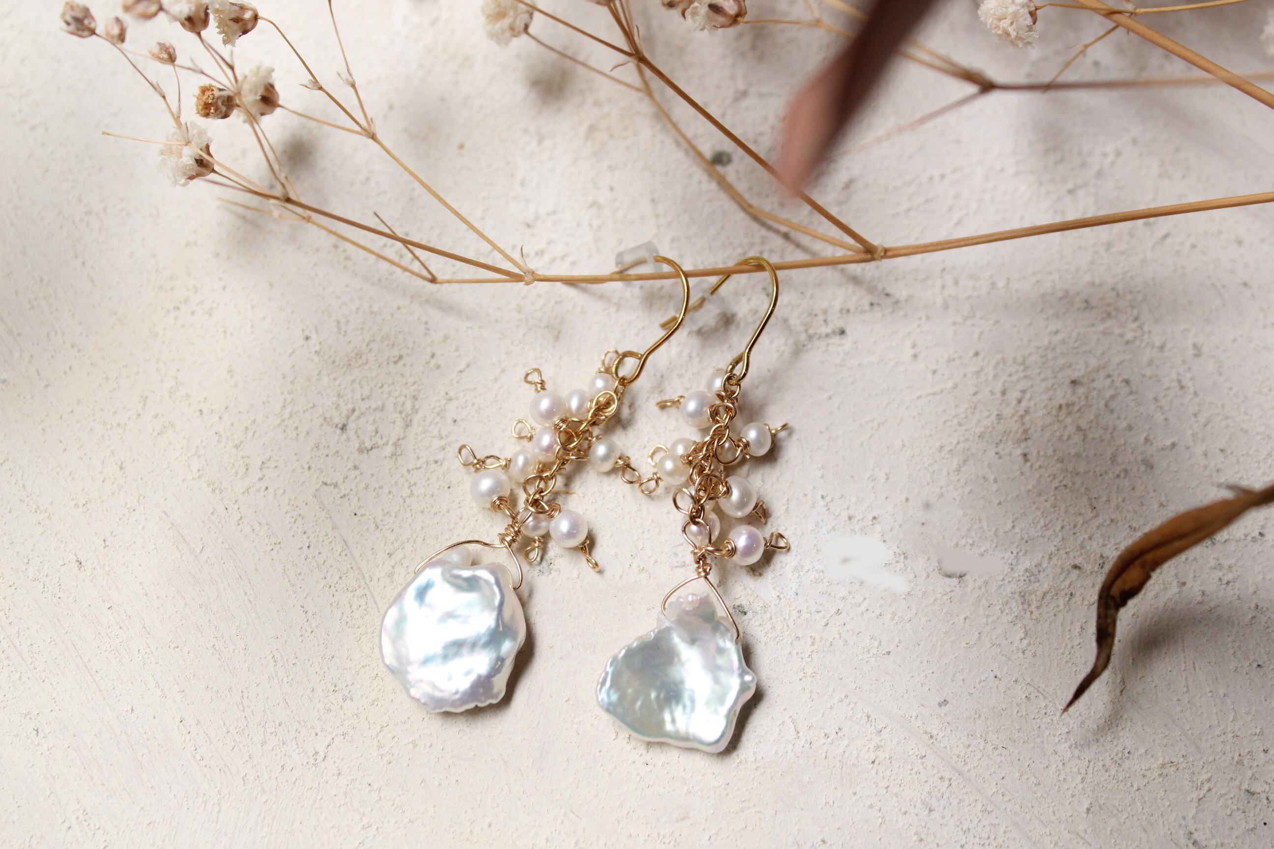 華やかで上品な輝きを放つバロックパールに9粒(片耳)の淡水パールがつき、華やかでフェミニンなピアスです。